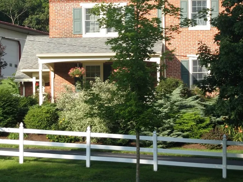● Cerca para paisagismo de propriedades residenciais: postes de PVC branco combinados com trilhos horizontais e vegetação criam um limite clássico de estilo imobiliário inglês ou americano.