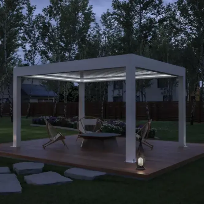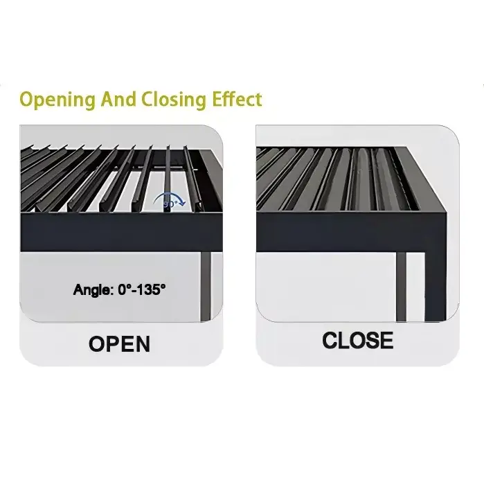 Uma pérgula motorizada com persianas é uma estrutura arquitetônica externa que não está anexada a uma casa. Funciona como uma unidade autossustentável, normalmente sustentada por quatro ou mais postes verticais. Graças ao seu design independente, esta pérgula de alumínio não necessita de fixação a outros edifícios; a sua estrutura independente permite uma colocação flexível em pátios, áreas de piscina, jardins ou ambientes comerciais, tornando-se um trunfo fundamental para valorizar qualquer espaço exterior. Além disso, construída em alumínio, a pérgula atende simultaneamente aos requisitos de durabilidade, manuseio leve e resistência à ferrugem - estabelecendo-a como a melhor escolha para soluções de sombra para exteriores.