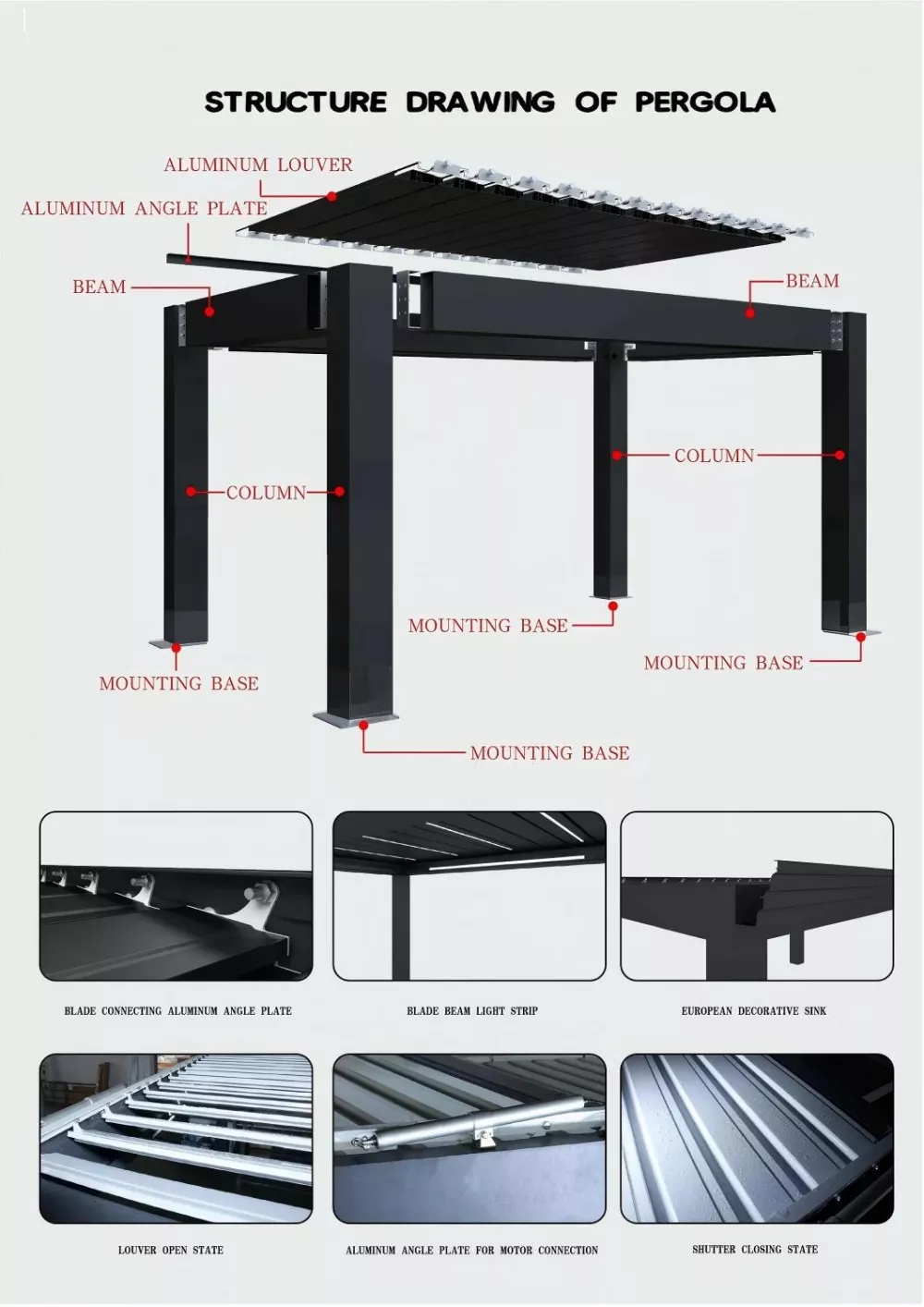 Para compreender completamente a sua essência, a pérgula com venezianas motorizada independente pode ser dividida em três componentes principaisEstrutura, Material, Design :