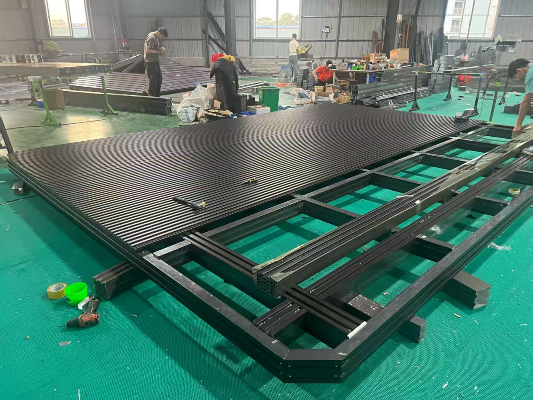 No chão da oficina, as estruturas da pérgula são primeiro montadas em seções. Colocamos a estrutura plana para facilitar o controle do alinhamento. Isso ajuda a garantir que cada ponto de conexão se encaixe corretamente e que as dimensões gerais permaneçam precisas.