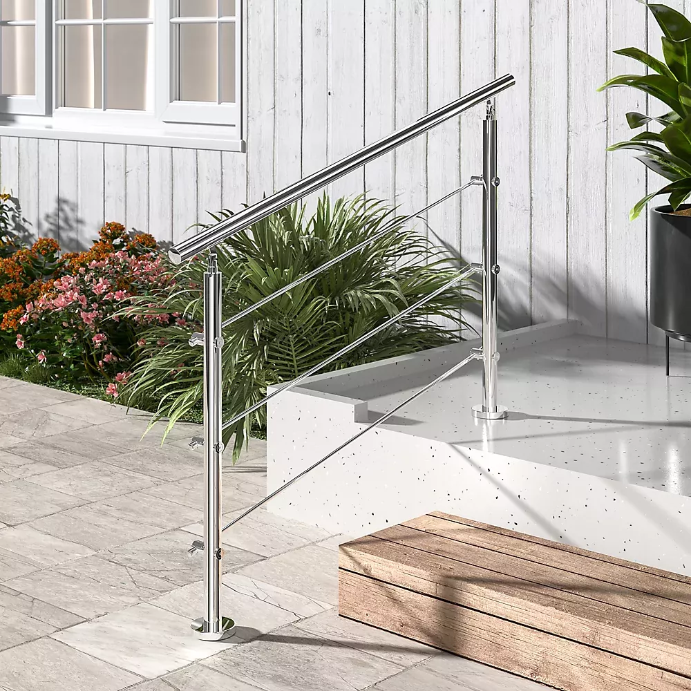 Feitos de aço inoxidável de alta resistência, os corrimãos de escada de aço inoxidável da Vionta são resistentes e duráveis, evitando escorregões de forma eficaz. O acabamento cromado os torna resistentes às intempéries e à corrosão. Esses corrimãos são fáceis de manter; simplesmente limpe-os com um pano ou enxágue-os com água. A barra central é adequada para crianças e também aumenta a estabilidade do corrimão.